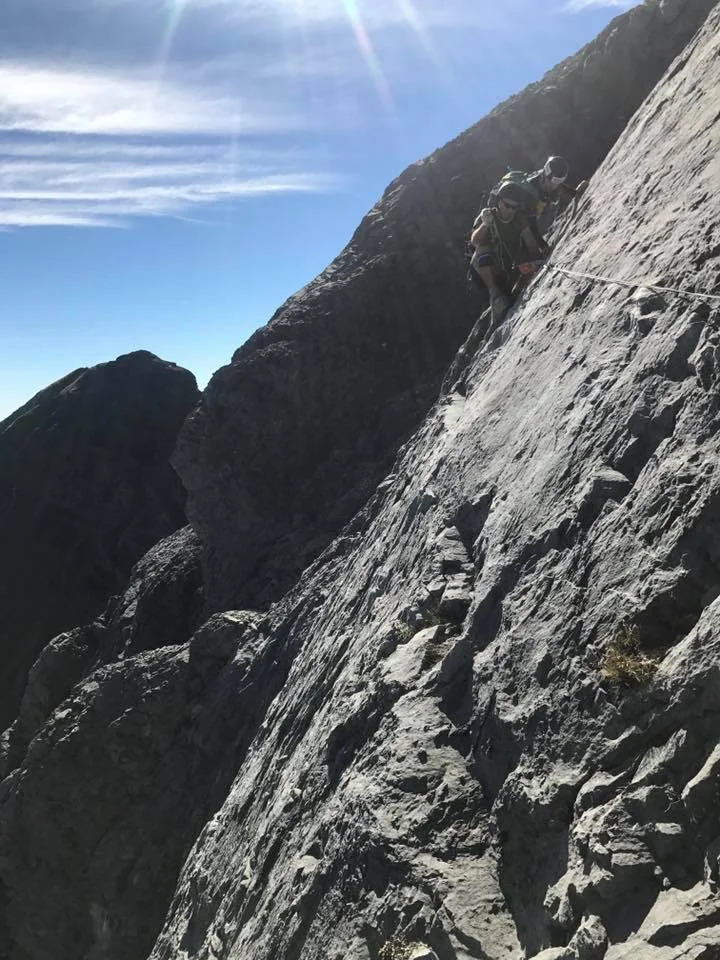 I went with adventure athletes Jake and Brent, 2 very solid performers. Jake has climbed throughout the European alps and is very fluid on the rock - here he points the footholds to Brent on the final part of the South Twin climb !!