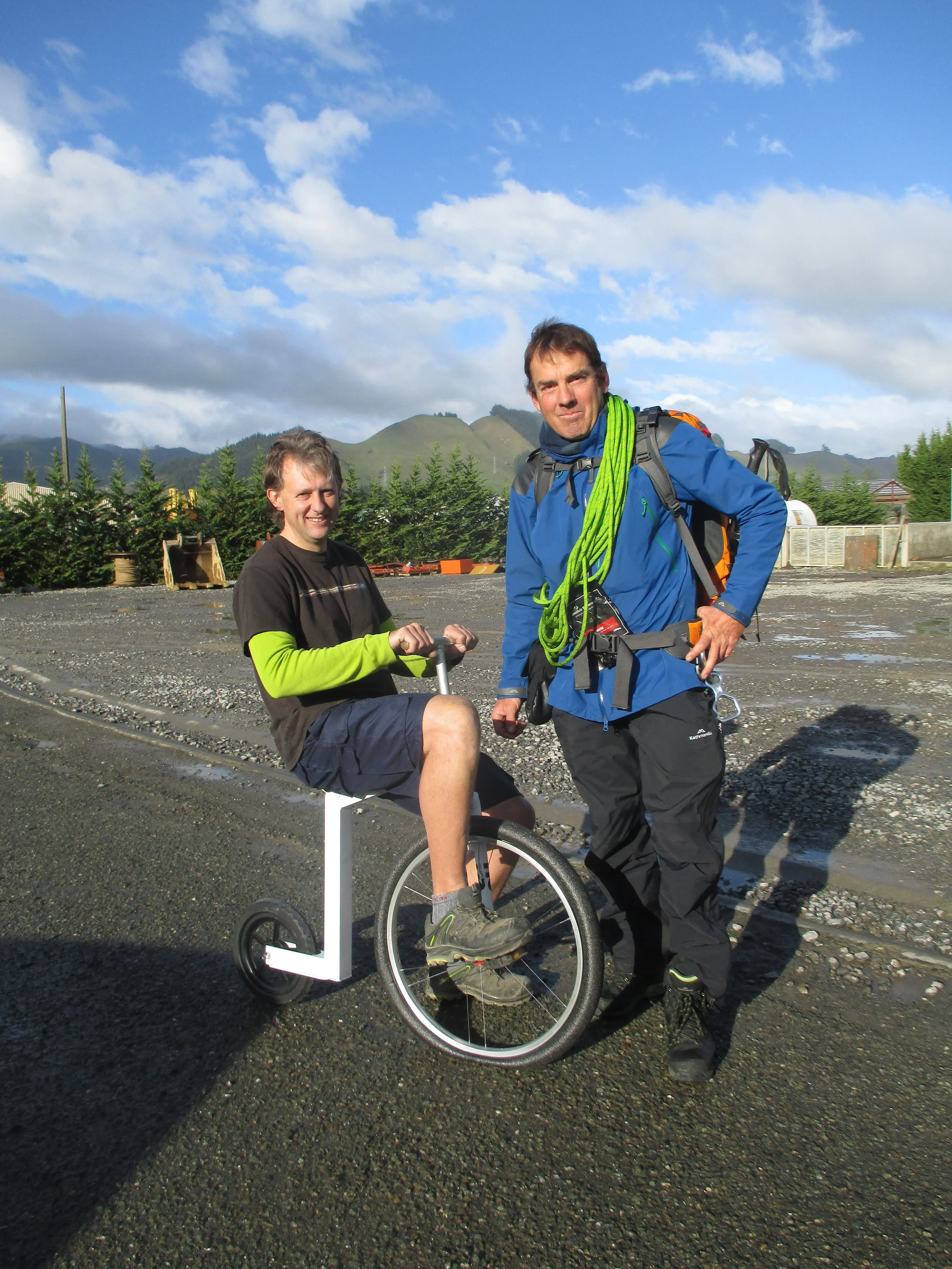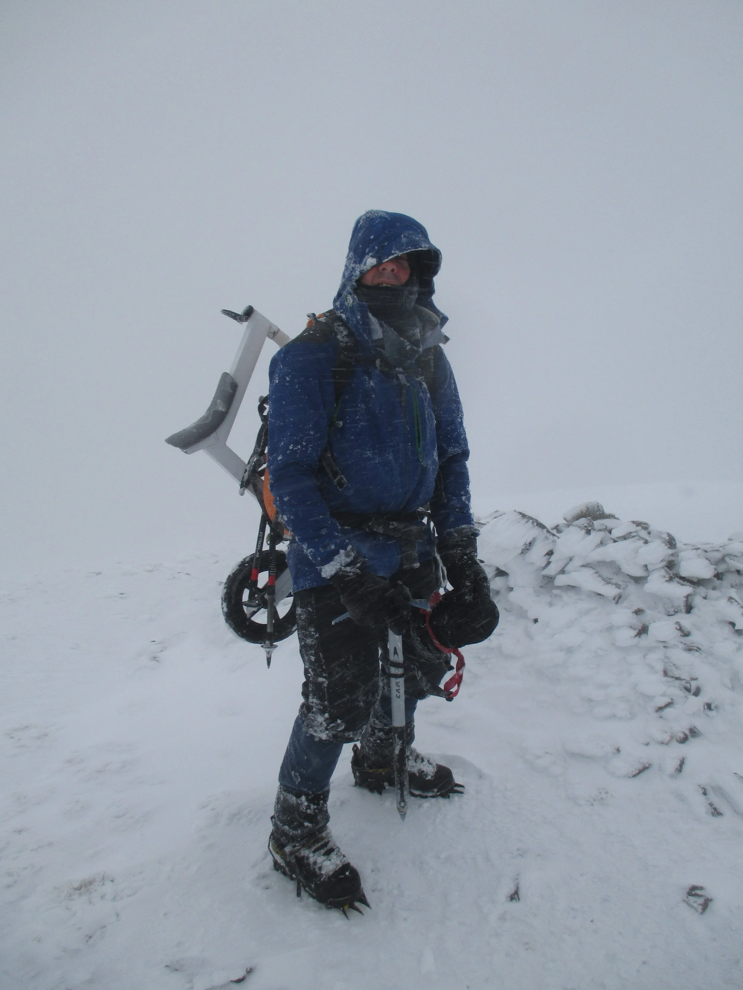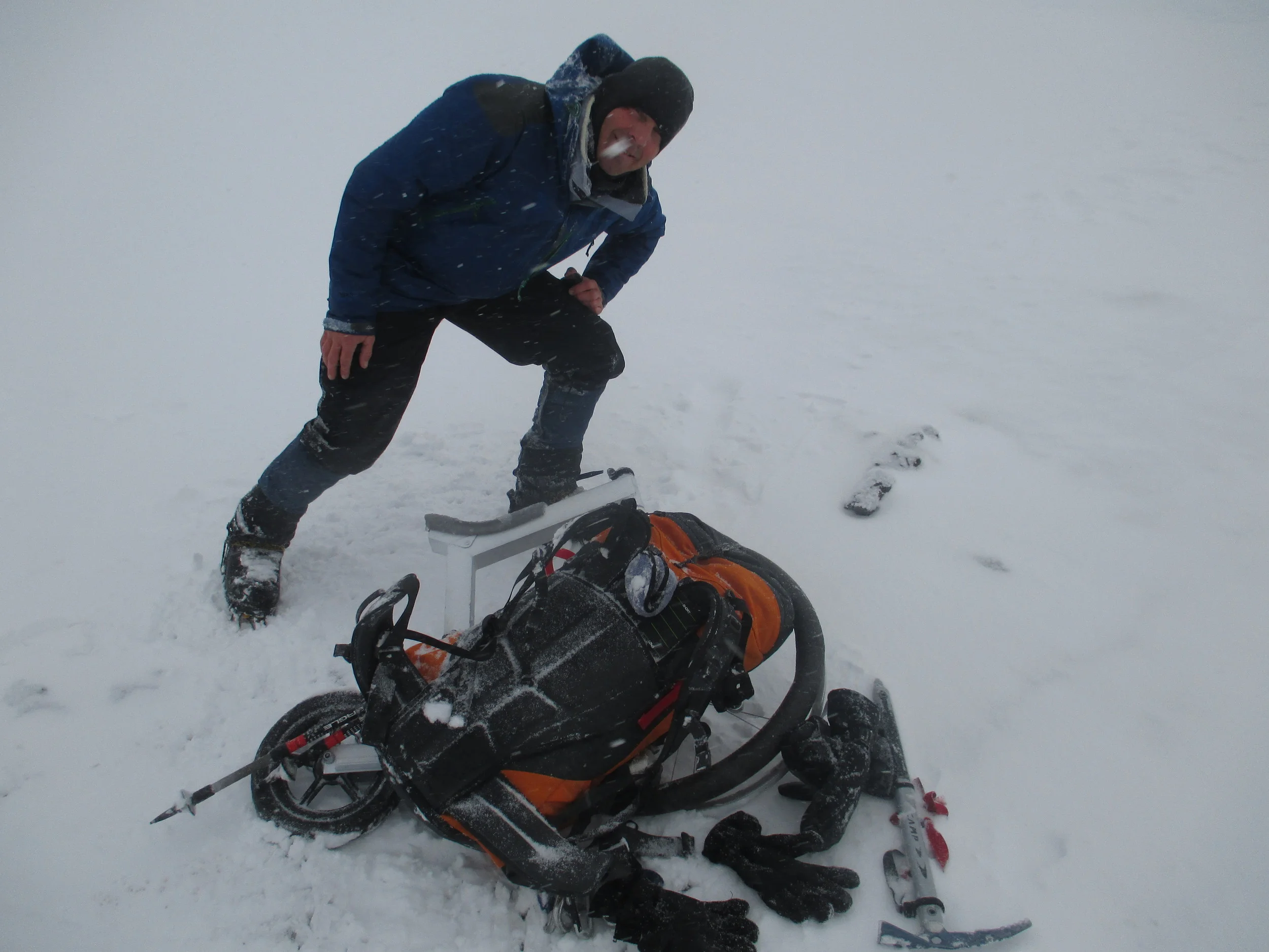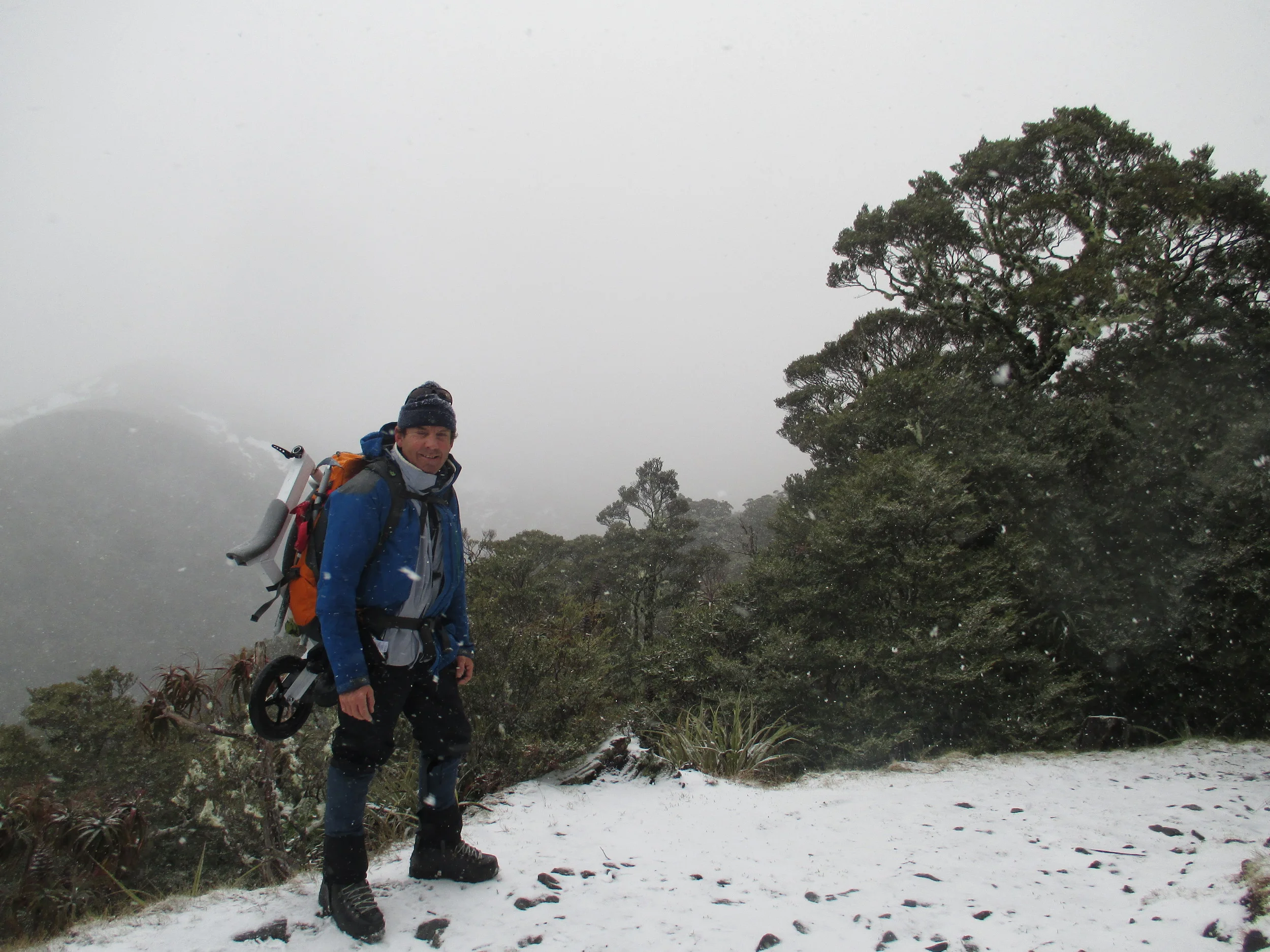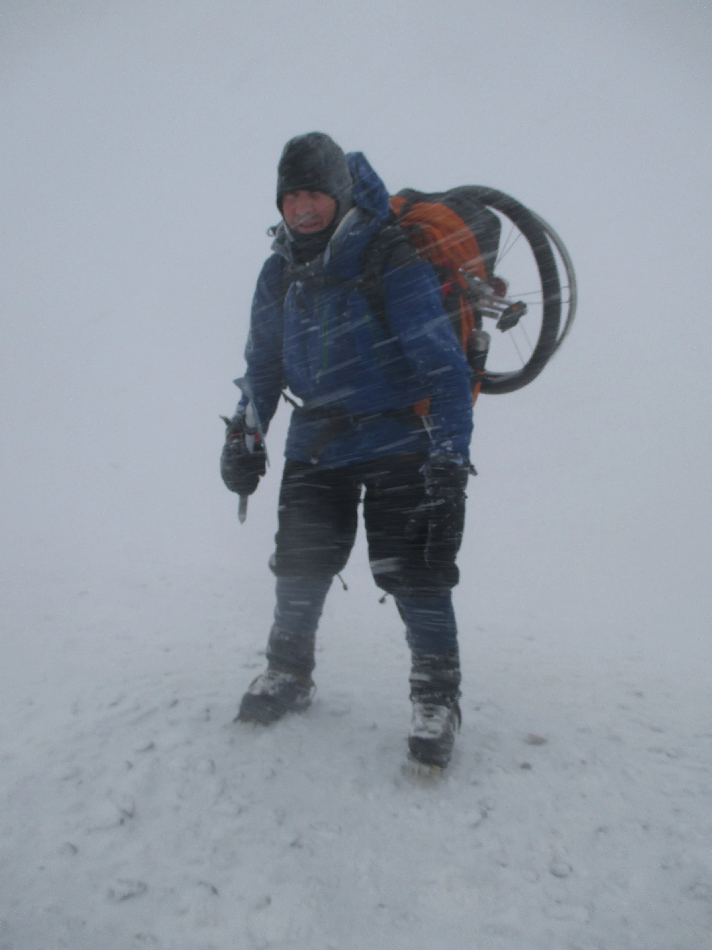 Got the bike ! my unique machine for Broad peak was built by Dean Rainbow in Bright water. The machine has 3 key components , light weight , extremely compact and very importantly its extremely simple , ie nothing to go wrong Regards plans on the mountain ,Zendo is going to take a normal bike and I am going to take this radical lightweight and easy to carry machine. we will attempt to carry both as high as we can. My bike can be carried almost fully built up which saves trying to put it together etc which maybe very difficult in the cold and on steep slopes. getting a normal bike up will be a great deal more complicated . The difficulty remains in trying to ride this machine - especially with mountaineering boots , crampons etc in the snow. On Sunday 21st , mid winters day got the first chance to test just how easy it is to carry the bike in perfect conditions on Mt Arthur , a blizzard with gale force winds. My new pack , a Kathmandu Incite 60 liters provided the base to carry the machine and I hooked it on with no modifications what so ever. Once again Sergio accompanied me and we had a great time and a great test. I had the pack loaded with gear as though on the mountain and despite gale force winds and fresh snow covering blue ice on top of Winter peak and Mt Arthur found the going good and only had a few minor slips. It was 5 hours before the load became uncomfortable but nothing dramatic and arrived back at car park after more than 6 and a 1/2 hours with only 2 crampon fitting stops. The only failure was to actually take the bike off and try it - in conditions were it was difficult to stand up on the 2 summits I decided to leave this to another day!! On another angle a good friend of mine set up a Go fund me page for this mission a link to which can be found on my front page if anyone is interested in helping contribute to the costs of this adventure.