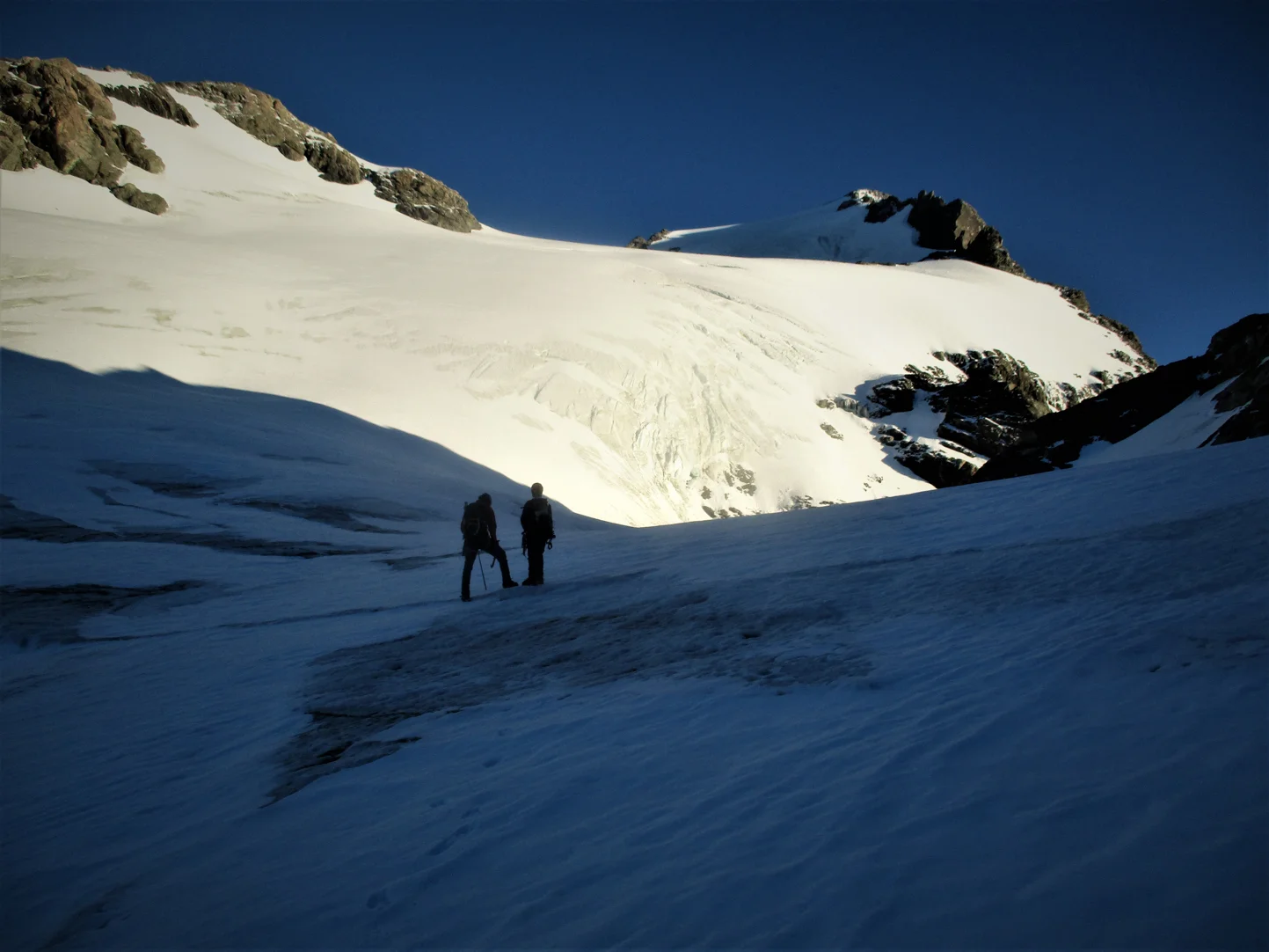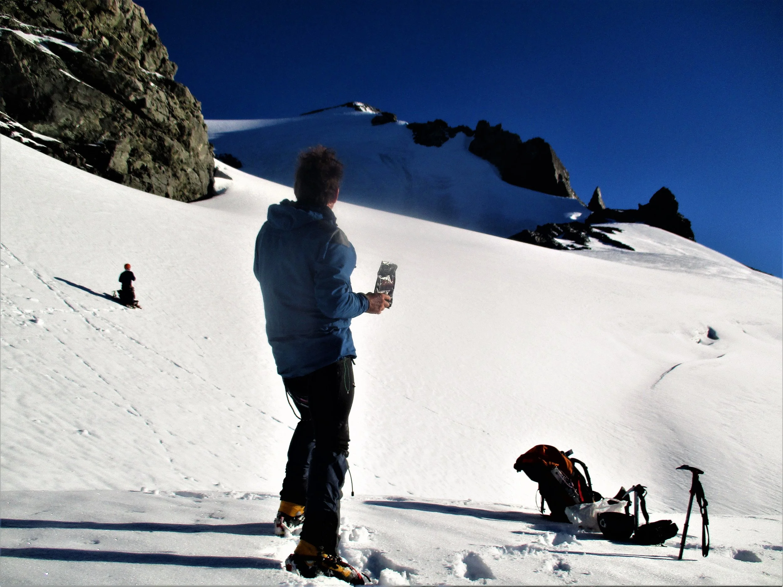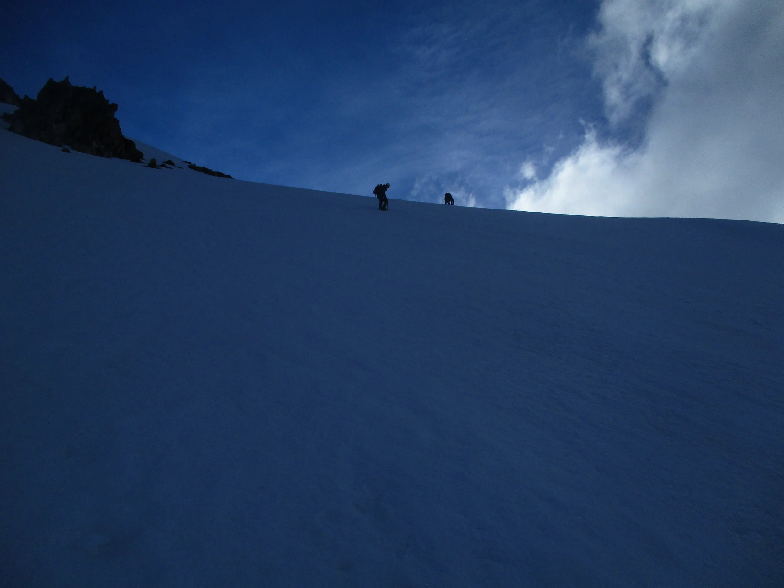Up till now as we began catching the early morning sun the climb up the Veil had been easy ,too easy maybe. It was my first time on a Glacier in almost 2 years and the last time was the chaotic mass of the Baltoro whose only similarity with this one was some ice underfoot. Ben had done all the planning leading up to the trip and now Jerome as doing all the leading up the mountain. I was ambling along in la la land enjoying the soft ice cream glacier - even the Bergschrund ( a large Crevasse) was filled in with all the recent snow. Looking up the summit route seemed quite clear but one worry remained , a traverse over ice cliffs looked imminent.