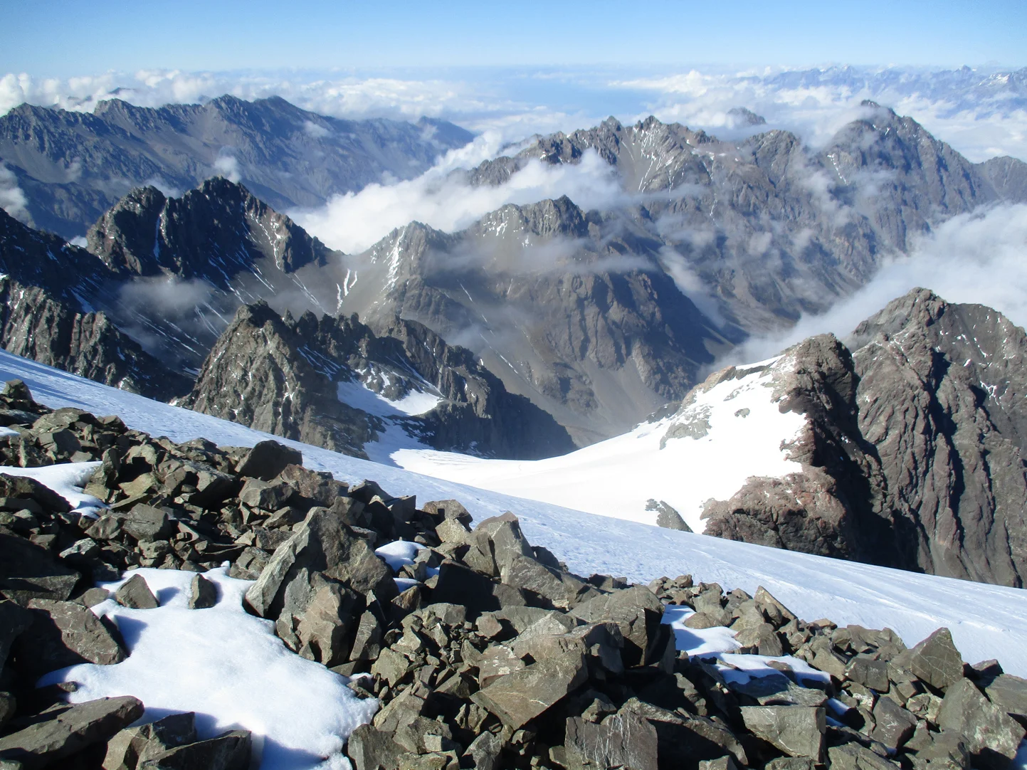 George and Ben descending a snowy arete. I hung out with Ben for most of the descent watching his effortless descent moving through the glacier just the same as the clouds and mist flowed over it. It was very enjoyable seeing a man so at ease on the terrain and his body almost seamlessly slid down the slopes. As George had said , the trip was worth it just to hang out with one of the legends of New Zealand Mountaineering.