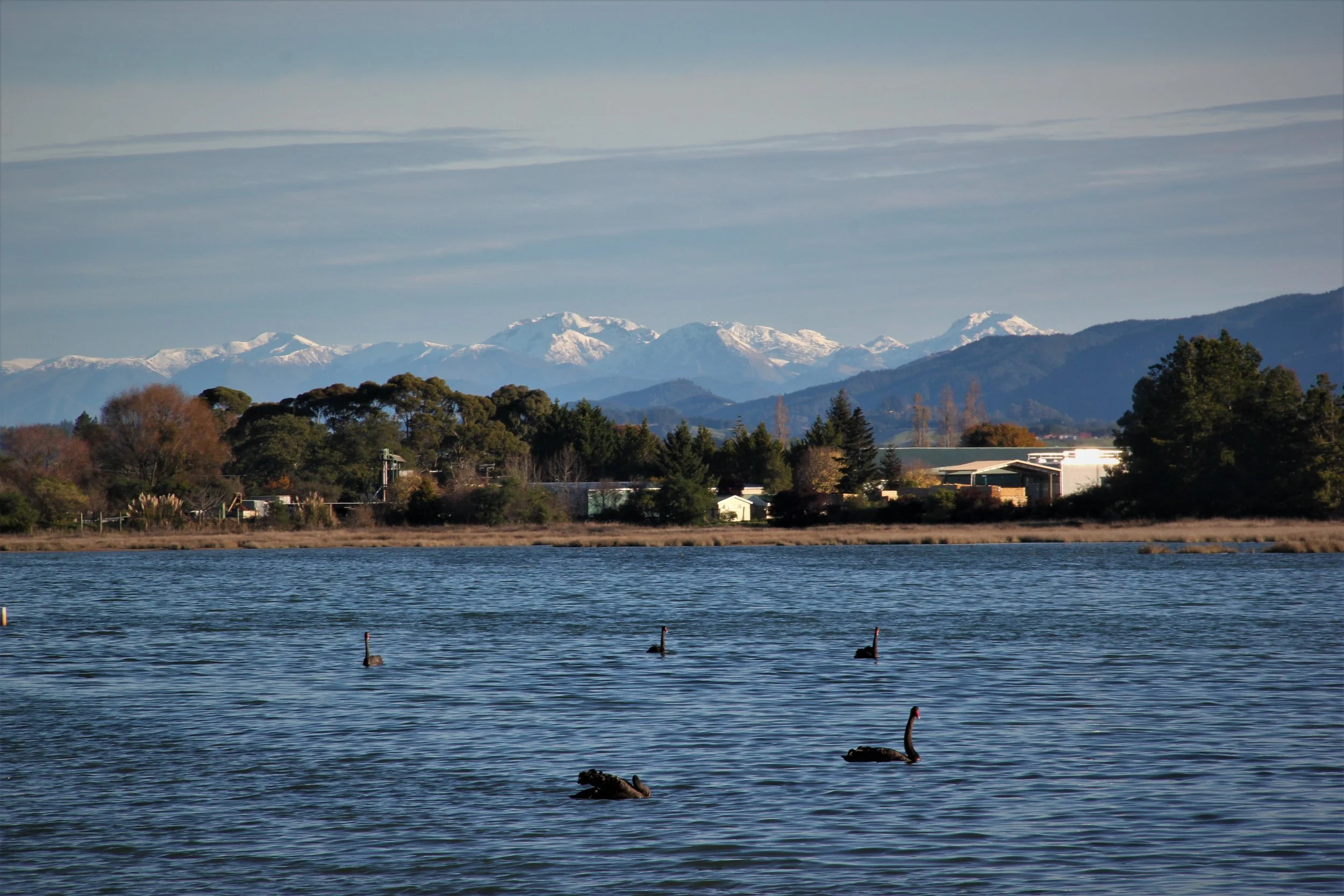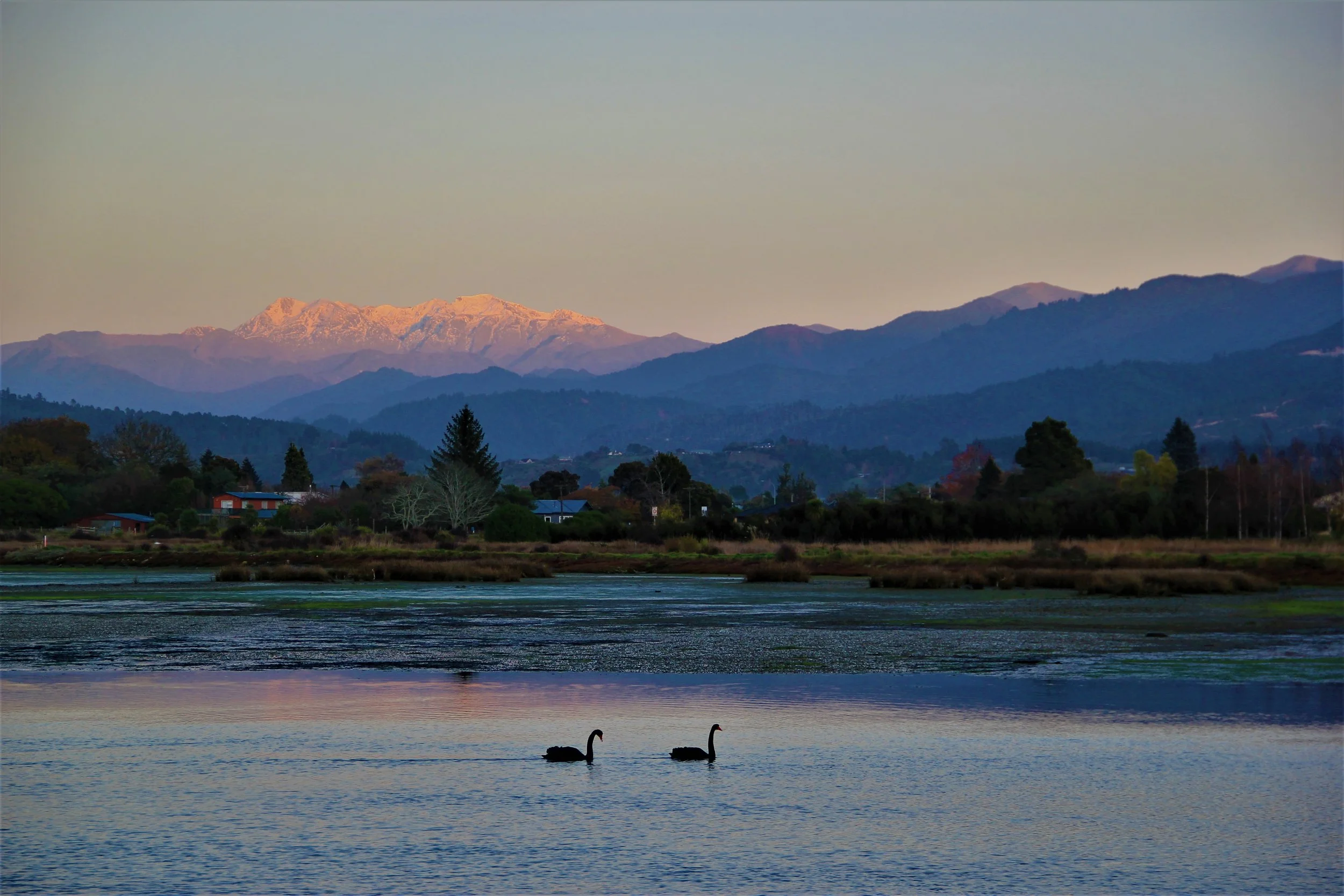 Looking West to the Arthur range on an early winter dawn. The Black swans live at the Nelson lakes during summer but migrate North and lower to the more benign climes of the Motueka estuary for winter.